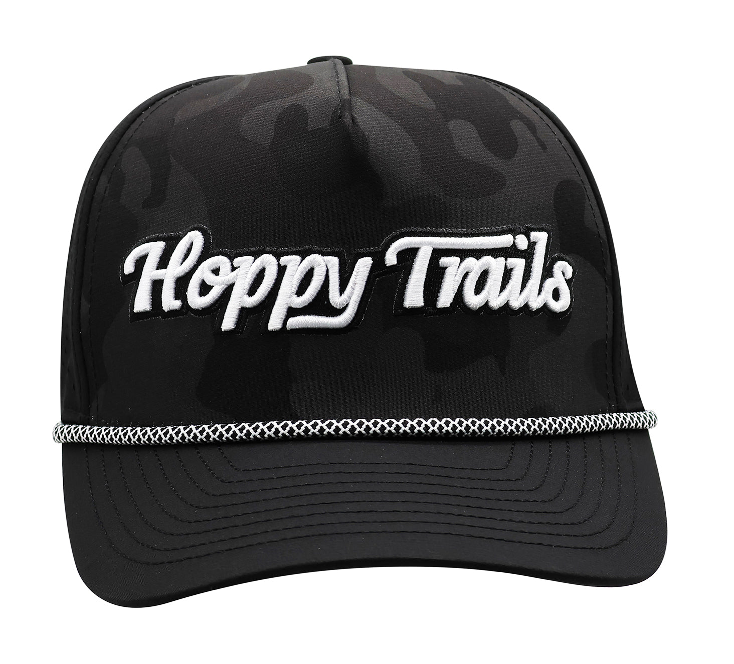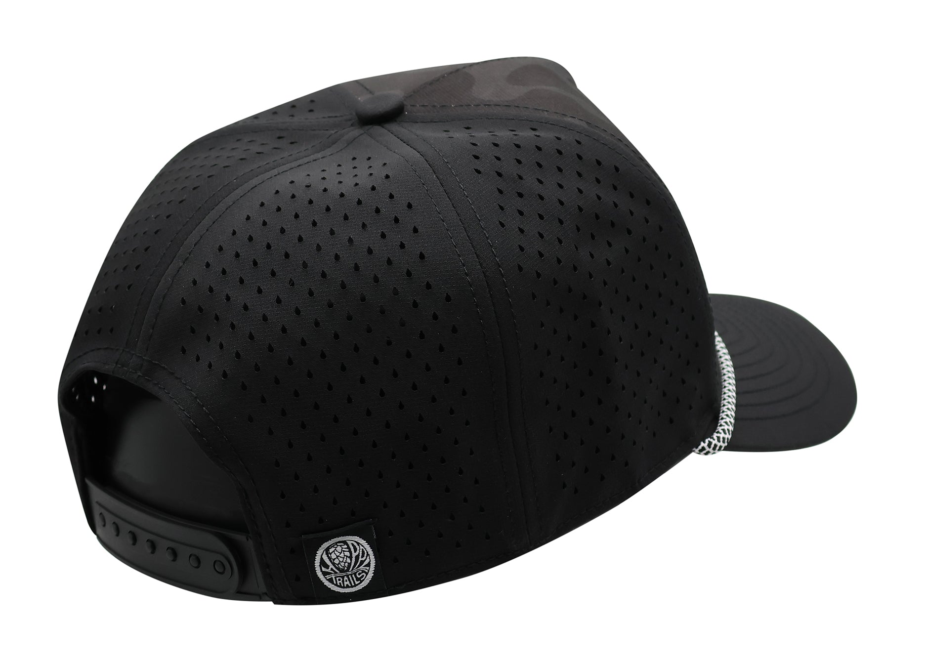 Black camo snapback golf hat made with synthetic waterproof material and lazer cut holes for breathability. 3D Embroidered main logo on front and diamond rubber patch on side with woven label on the rear.