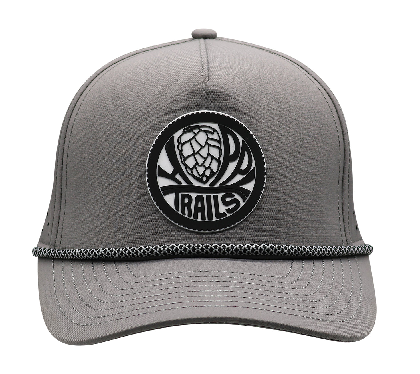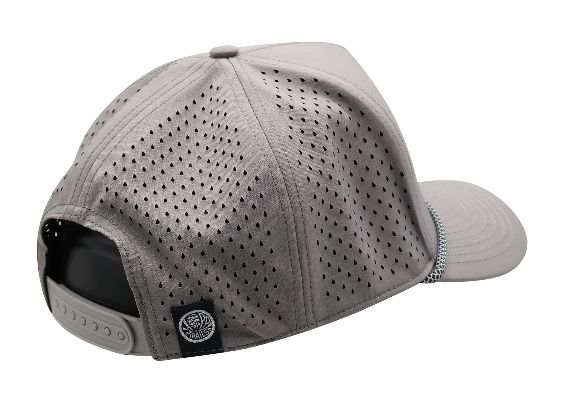 Golf snapback hat made with synthetic waterproof material and lazer cut holes for breathability. Rubber patch main logo on front and diamond rubber patch on side with woven label on the rear.